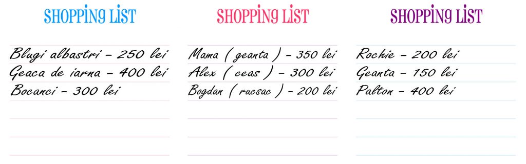 A doua listă va cuprinde obiectele pe care vreau să le cumpăr pentru alte persoane. Iubesc să fac cadouri, iar dacă bugetul îmi permite, cu siguranță o voi face. Această listă va cuprinde numele persoanelor dragi și câte un obiect pe care aș dori să îl ofer fiecareia. Spre exemplu, cu siguranță numele mamei mele se va regăsi alături de o geantă de damă (ea fiind o colecționară de genți).